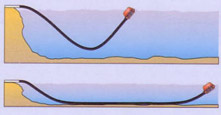 The floating strainer normally floats with the hose hanging in a loop. part of the strainer may be above the water surface, but air will not be drawn in, as the entry tube is well submerged. In shallow water a longer hose is practicable as it rests partly the bottom.