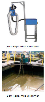 Rope mop oil skimmers are suitable for permanent or temporary installation and consist of a drive unit and a length of oleophillic (oil attracting) rope. The rope is driven over the surface of the oil. The oil sticks to the rope and is carried back to the drive unit where it is removed.